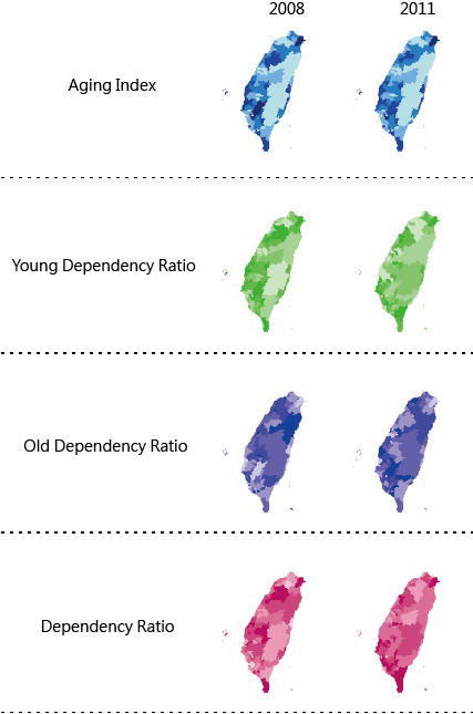 Most of towns in Taiwan have increments in Aging Index from 2008 to 2011 , but there are some eastern towns have declines in Aging Index.