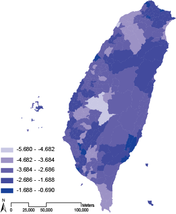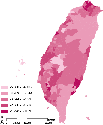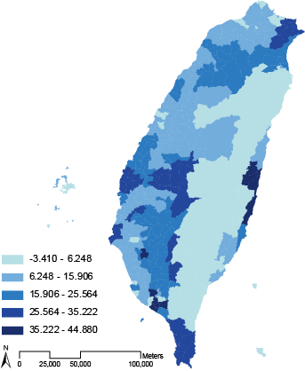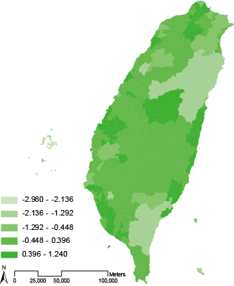 Generally speaking, towns in western Taiwan have greater positive changes against towns in eastern Taiwan. LiouChou in PingTung has the largest change ( + 1.24 % ) ,which means either the nubmer of the elderly there has been increasing or the number of people aged 15 - 64 has been declining.